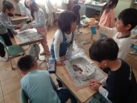 給食の後、歯磨きをしています。歯磨きを楽しくビデオにあわせてできています。