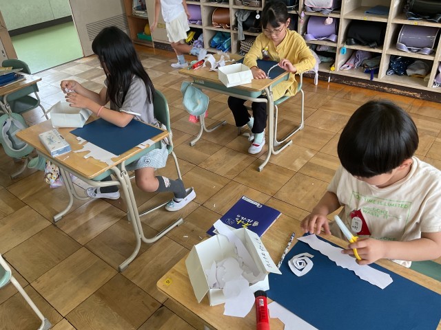 ジグザグ、ふにゃふにゃ、ぐるぐる、、、紙を様々な切り方で切って並べ、何を表現しようか考えました。