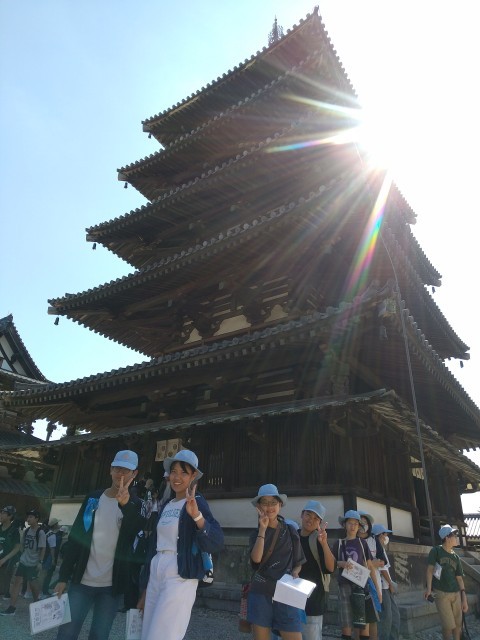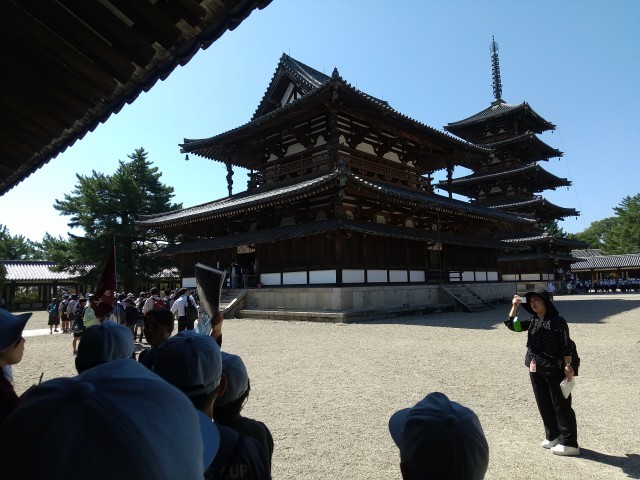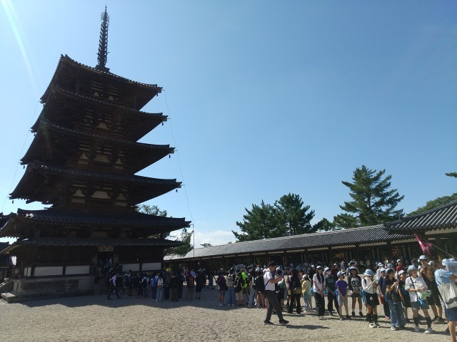 たくさんの修学旅行生がいるので,順番を守って五重塔・金堂などを見学中です。奈良時代の歴史や,古い建造物が残っていることの偉大さを感じ取ってほしいです。
