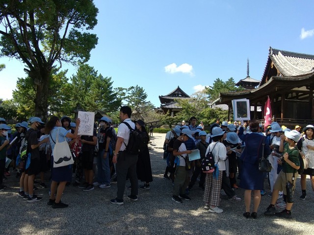 法隆寺の宝箱とも言うべき,大宝蔵院の見学の前に,ガイドさんから見どころのレクチャーを受けています。