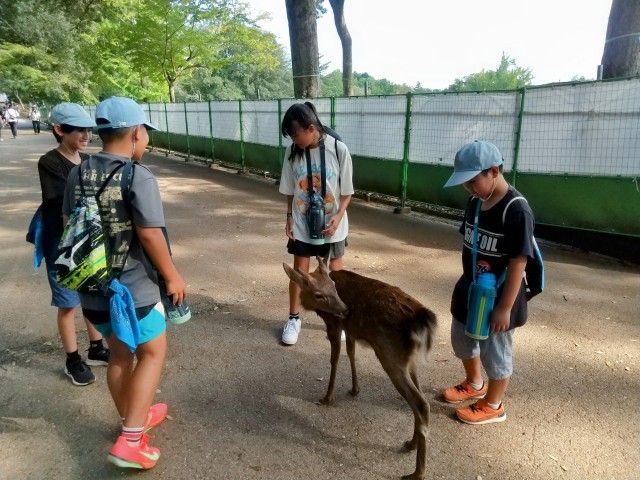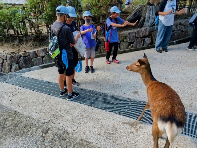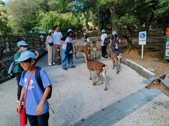 班別学習が始まりました。鹿を間近で見たくてたまらない子どもたち。購入した鹿せんべいをあげて,思う存分戯れるグループもありました。