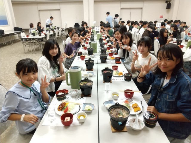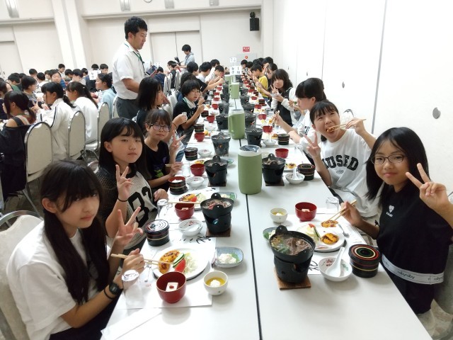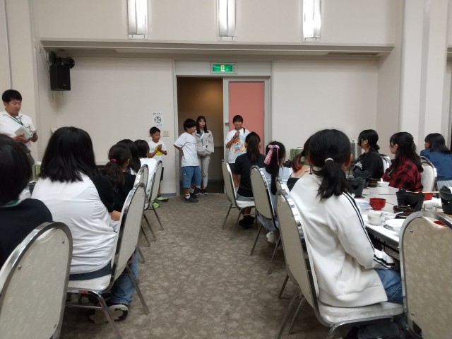 日中たくさん歩いたので,お腹はペコペコです。実行委員のあいさつのあと,みんな,ご飯をモリモリ食べています。ご飯を何回もお代わりする子もいました。