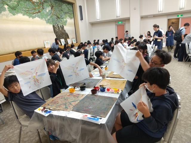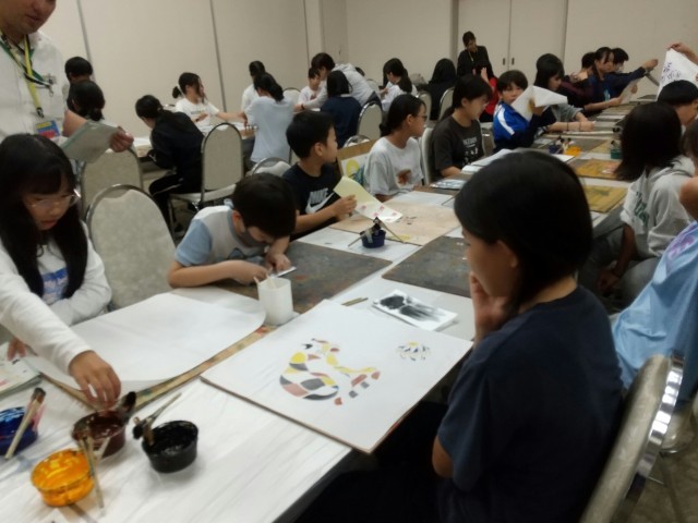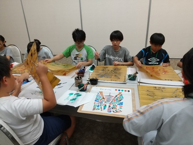 夕食後,染め物の体験をしました。数枚の型紙を順番に布にあてて,絵の具を塗り重ねていきます。完成した作品に,どの子も満足気でした。