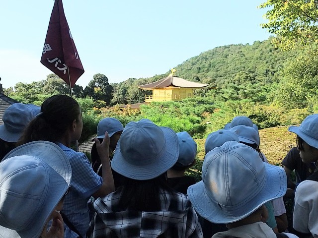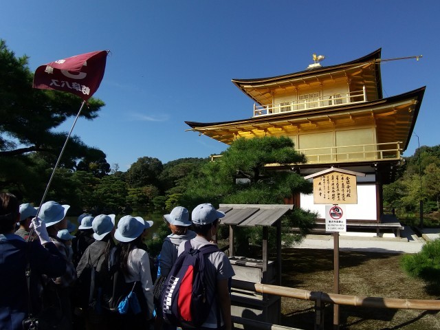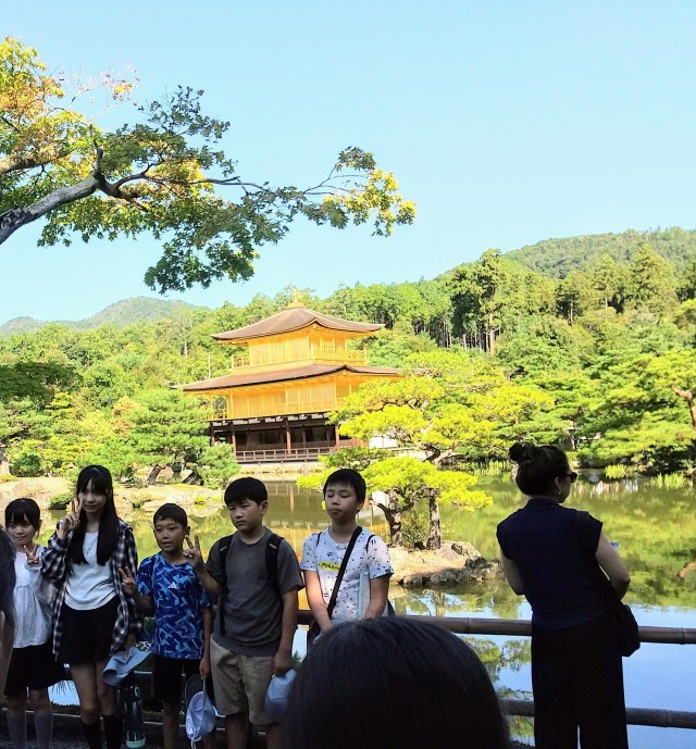 青空のもとで輝く 鹿苑寺舎利殿 に感嘆の声をあげながら,子どもたちは室町時代に思いを馳せています。