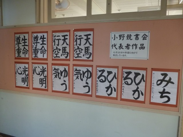 10月25日に第90回県下児童・生徒席上揮毫大会が春日井の小野小学校で行われます。その本選に向けて、学校代表の11名は、練習に励んでいます。図工室前に作品が掲示されていますので、ぜひ見に来てくださいね。学校代表の11名に温かい声援をよろしくお願いします
