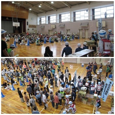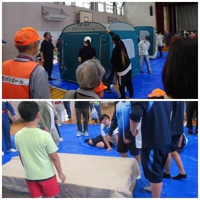 朝から地域の多くの方々が訓練に参加され,シェイクアウト訓練に始まり,避難所開設・避難スペースと段ボールベッド設営・災害用トイレ設営・緊急物資搬入などの訓練が,皆さんの協力のもとで進められました。中学生や小学生の参加も見られました。