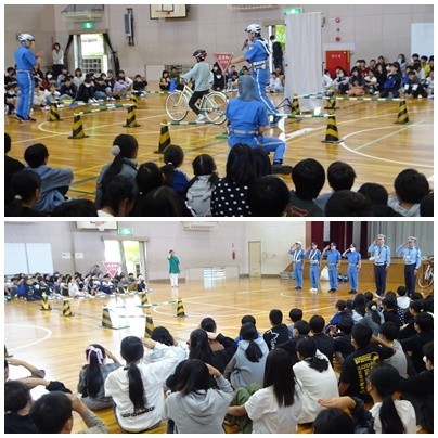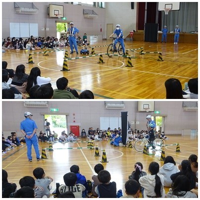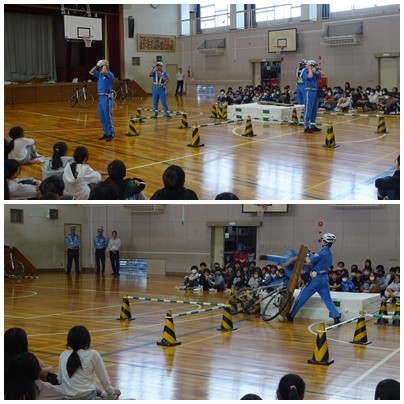 愛知県警「BーForce」をお招きし,低学年と高学年の二部制で交通安全教室を行いました。