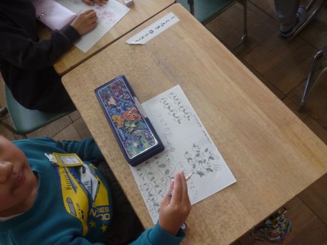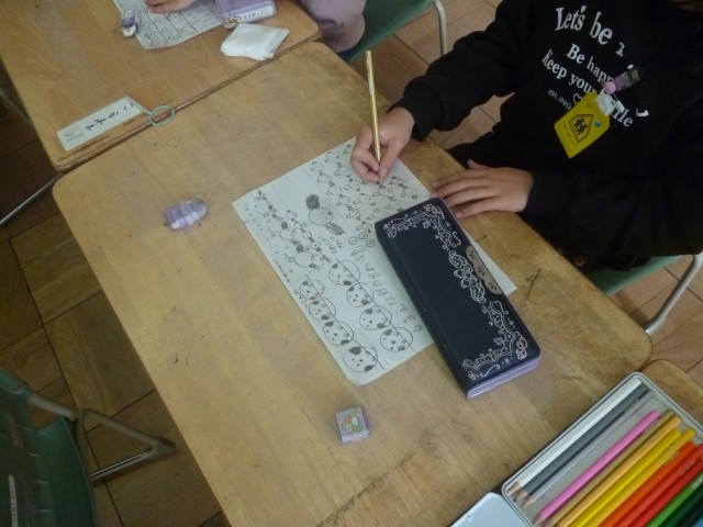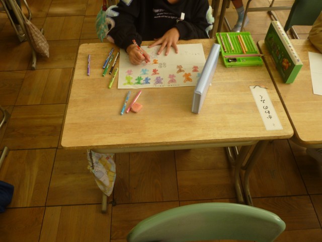 たし算を使った紙芝居作りに挑戦しました。3枚の絵を描いて、お話を考えながら問題を作りました。答えとなる式も自分で書いて、「これは答えだから、みんなに見えないように隠さなきゃ」と、自分の答えが見えないようにしながら制作を進めました。自分の好きな動物や食べ物をたし算で増やす様子が楽しそうでした。次の時間はひき算を使った紙芝居を作ります。どんな絵になるのか楽しみですね。