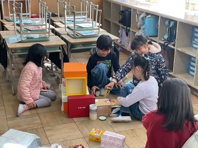 箱を並べたり積んだりして思いついたものを、みんなで協力して作りました。箱の大きさや色にも注目して、使ってみたい箱を自由に選び、友達と意見交換しながら作業を進めました。