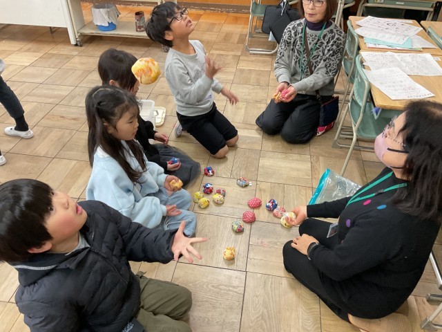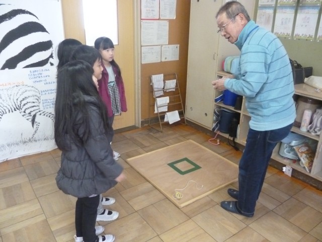 生活科の学習で、昔の遊びに挑戦しました。いつもお世話になっている地域の方々をお招きして、遊び方や道具の使い方を教えていただきました。地域の方々は昔遊びの達人ばかりで、その技に歓声が上がりました。「初めてこまをまわせたよ!」「けん玉が1回だけ成功した!」「あやとりではしごが作れた!」子どもたちはあっという間に達人から技を伝授されたようです。いつも見守っていただいている地域の人との楽しい時間を過ごし、寒さが厳しい時期ですが、心も体もはポカポカと温かくなりました。かけがえのない時間を作ってくださった 地域の達人 のみな様、本当にありがとうございました。