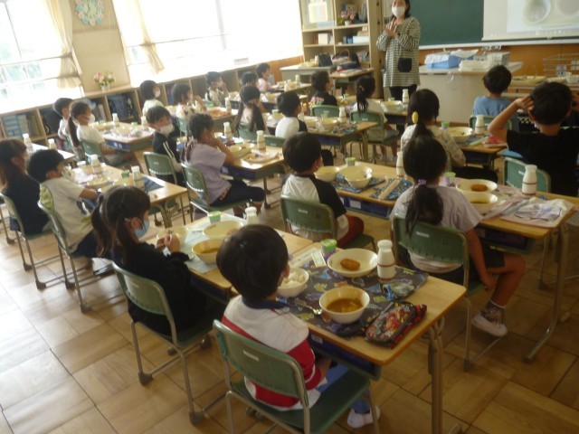 1年生にとって記念すべき初めての給食がありました。朝から「何時になったら給食食べるの?」と、子どもたちはワクワクした様子でした。いざ給食が始まると、先生のお話をしっかりと良い姿勢で聞き、一所懸命に取り組む姿が見られました。みんなで協力して準備したカレーはとってもおいしかったです。初めてのことばかりで少し疲れた様子でしたが、みんなの笑顔がたくさん見られた素晴らしい時間になりました。これからも、たくさんの「はじめて」を一緒に経験しながら、楽しく成長していきたいと思います。