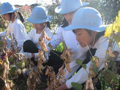 今日は、JAや婦人部の皆様に教えていただきながら、大豆の収穫をしました。