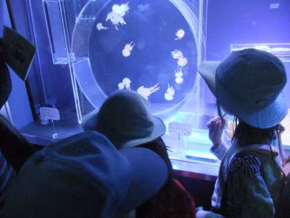 水槽の前のパネルを見て名前を確かめたり、きれいなクラゲにうっとりしたりと、クイズにも挑戦しながら楽しく見学できました。