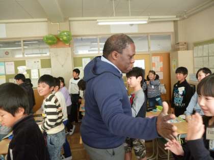 きょうの3年生の英語は、自分の気持ちを表すじゃんけんバトルをしたり、Do you like〜?とペアで聞き合ったりしました。最後に、教科書のカードを使って、かるたとりを楽しくやりました。アレン先生との会話もはずみ、笑顔の英語の時間でした。