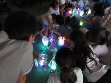 先週土曜日に保護者の方々と一緒に作った作品を、みんなで集めて一斉に光らせてみました。