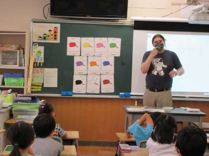 今回は、果物や色、数のレッスンで、教室の中から色を探すゲームをしたり、プリントを使ったりして学習しました。