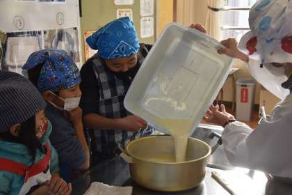 今日は待ちに待った豆腐づくりの日でした。JAの方々に教えてもらいながら作り、自分たちが普段食べている豆腐が、様々な工程を経てつくられていることがわかりました。1学期に種から育てた大豆を使って作った豆腐の味はどうだったでしょうか。