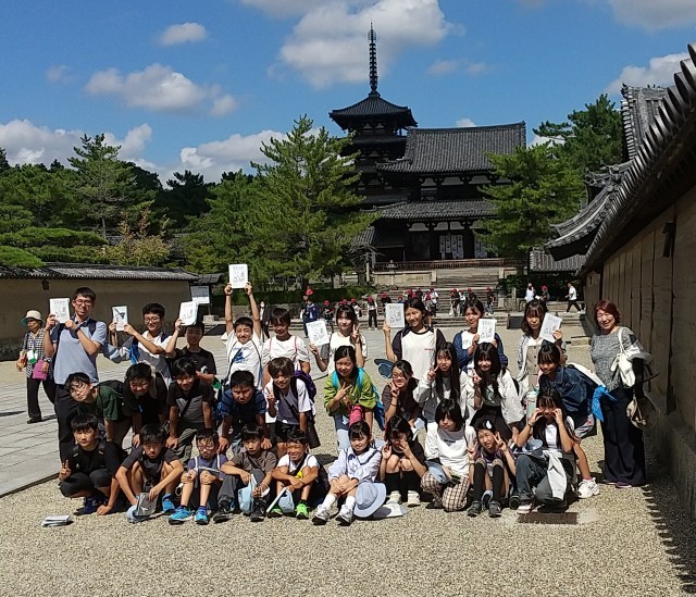 たくさんの修学旅行生がいるので,順番を守って五重塔・金堂などを見学中です。奈良時代の歴史や,古い建造物が残っていることの偉大さを感じ取ってほしいです。