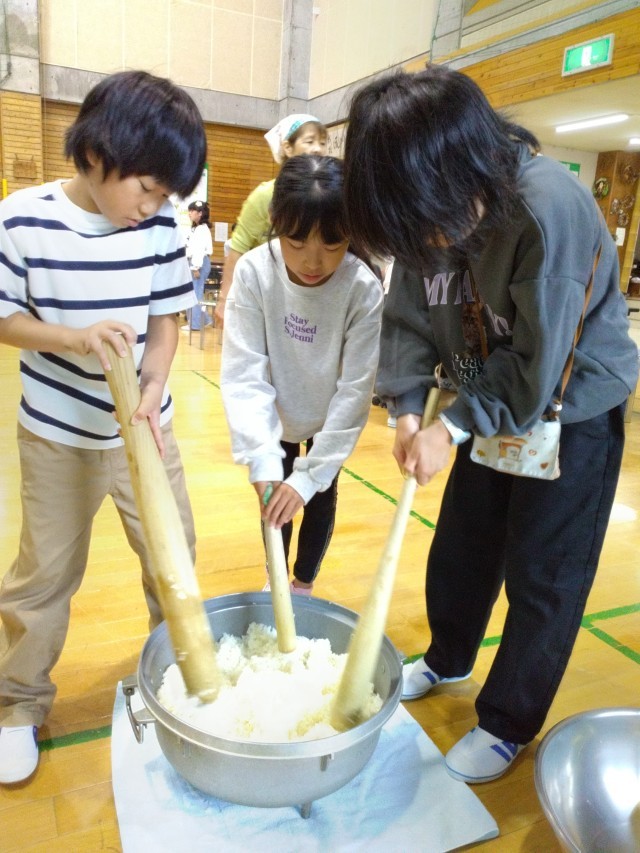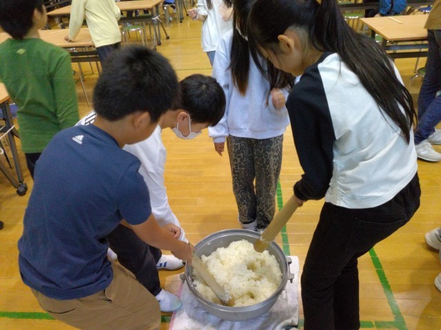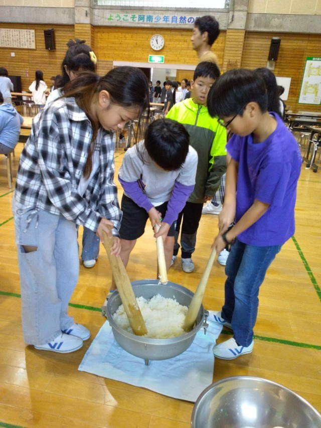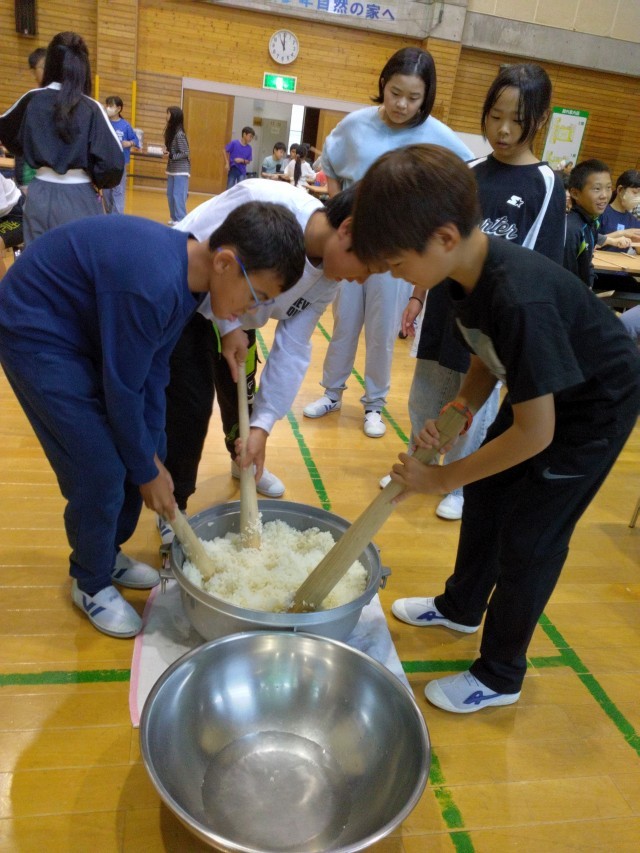 キーホルダーづくりを終えた子どもたちは、自然の家に戻り、五平餅づくり。