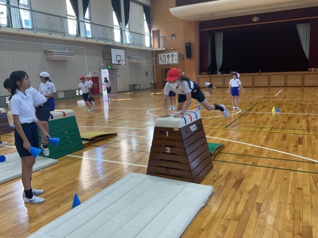 6年生は体育で「跳び箱」に取り組んでいます。今回は開脚とびに挑戦し、着地の位置をなるべく遠くすることを目標に練習しました。