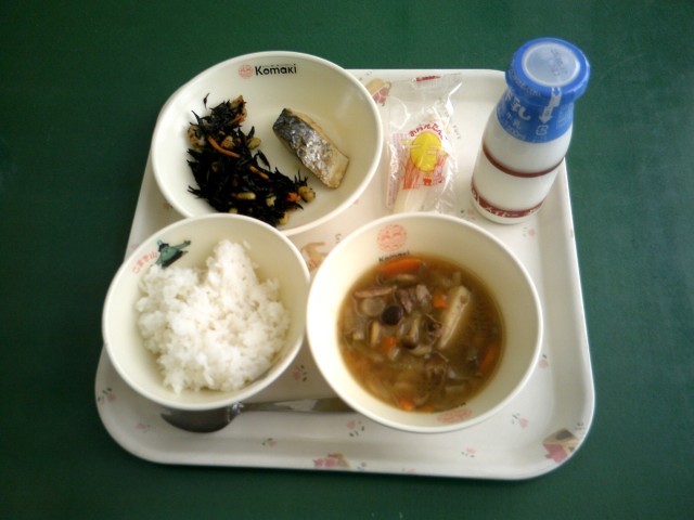 今日の献立は、ごはん、牛乳、いも煮、寒さわらのごまだれかけ、ひじきのいため煮、月見団子 です。