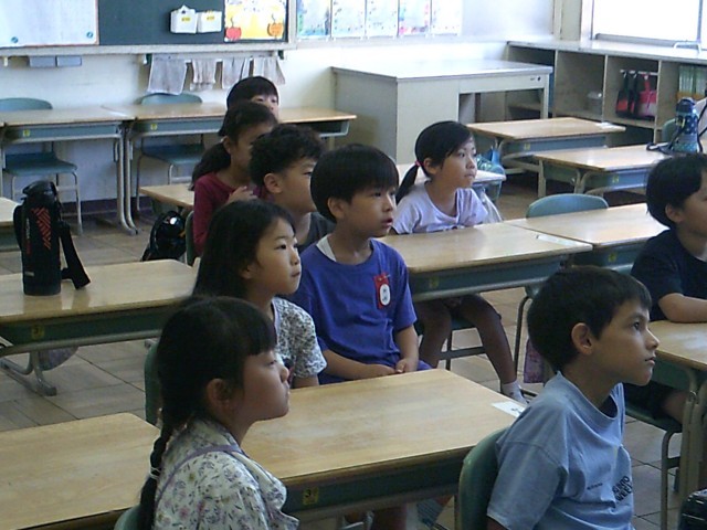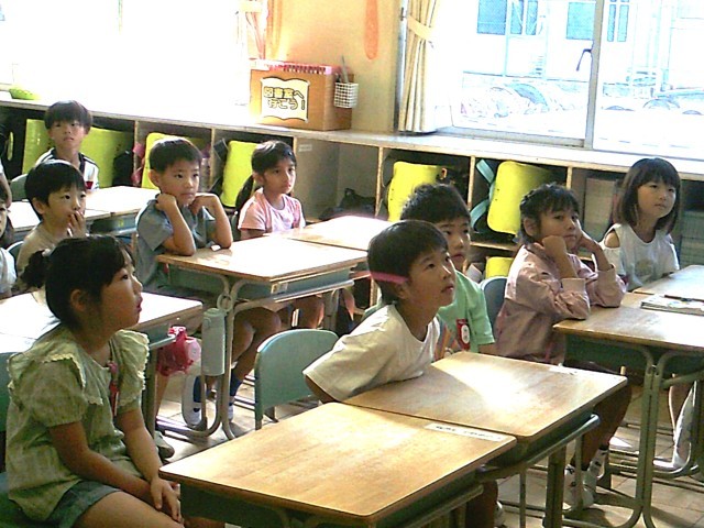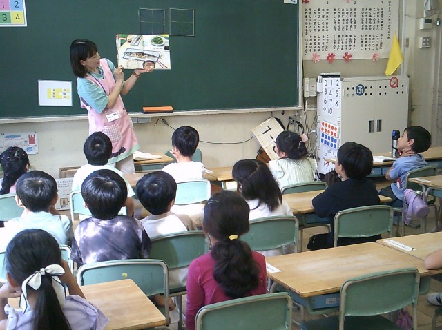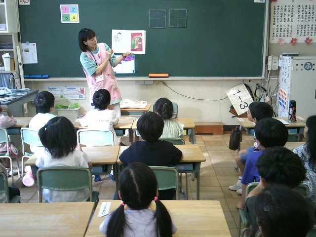1年生の教室では、司書の先生が絵本の読み聞かせ。