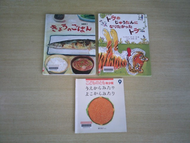 今日のお話は、『トラのじゅうたんになりたかったトラ』(ジェラルド・ローズ)、『きょうのごはん』(加藤休ミ)、『うえからみたり よこからみたり』(麻生知子)の3冊。