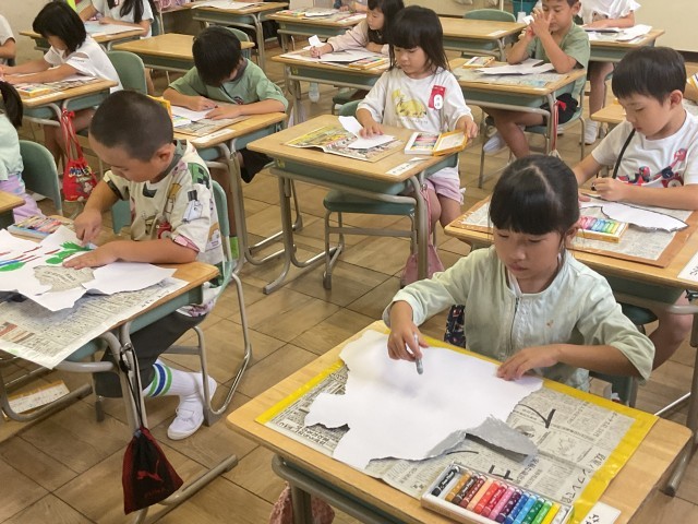 自分たちがやぶった画用紙の形から、想像を膨らませて描いていきます。