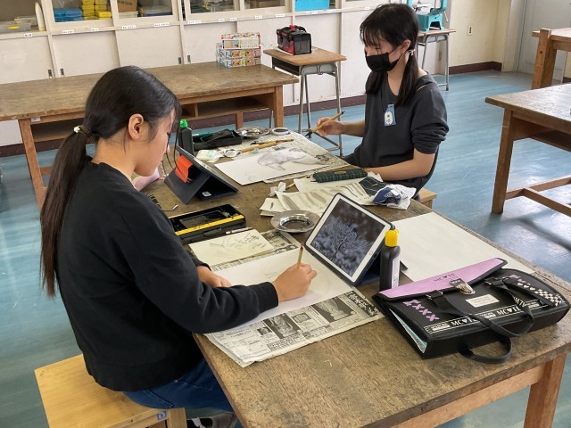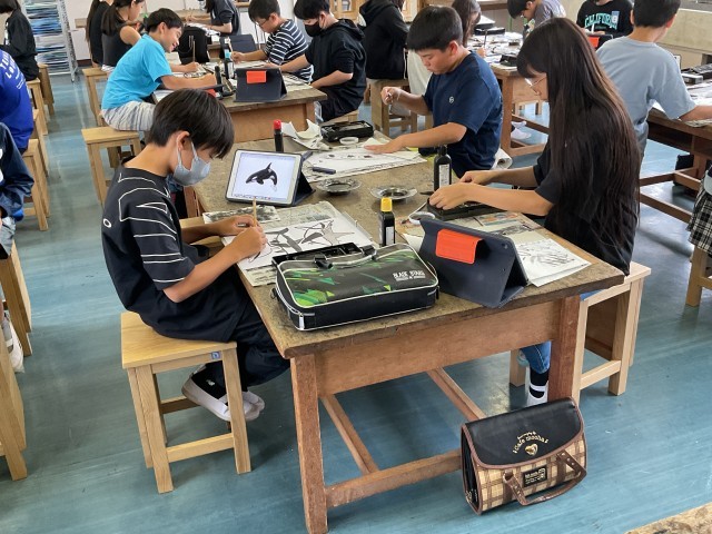 6年生は、いよいよ図工競技会本番を迎えました。これまでの練習で身に付けた濃淡やかすれ、にじみの表現を生かしながら、集中して筆を運びました。自分の思いを込めた作品を仕上げようと、一人一人が真剣な表情で取り組みました。