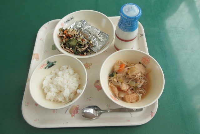 今日の献立は、ごはん、牛乳、肉豆腐、さんまの銀紙焼き、チーズ入りひじきのマリネ です。