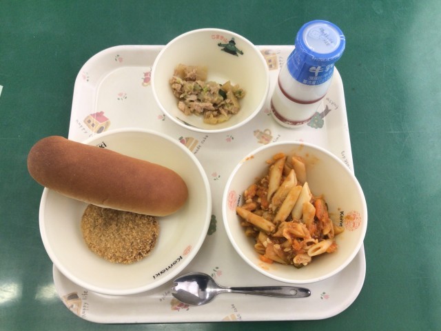今日の献立は、小型ロールパン、牛乳、ミートソースペンネ、米粉のコロッケ、こんにゃくサラダ です。