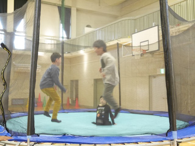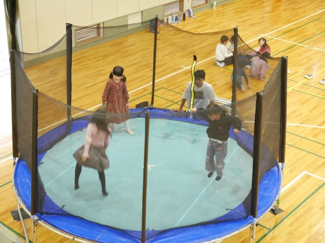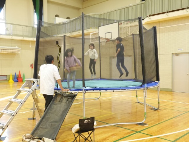 大きなトランポリンを設置して、3人グループで2分ずつ楽しみました。