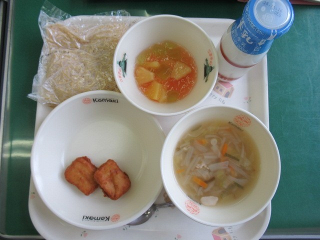 今日の給食は、牛乳、中華めん、塩ラーメン、とうふナゲット、フルーツゼリーあえ です。