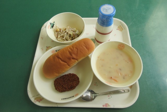 今日の献立は、ロールパン、牛乳、白いんげん豆のクリームポタージュ、焼きメンチカツ、根菜サラダ です。