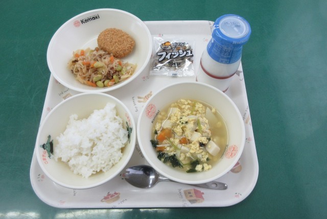 今日の献立は、ごはん、牛乳、かきたま汁、さつまいものコロッケ、切り干しだいこんのいためもの、乾燥小魚 です。