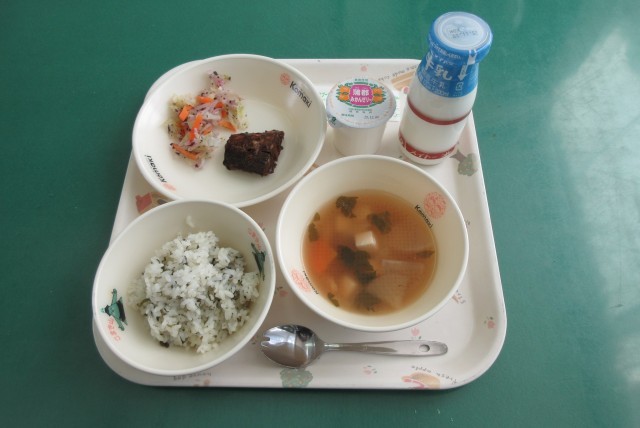 今日の献立は、わかめごはん、牛乳、根菜汁、さばの八丁みそ煮、キャベツの赤じそあえ、蒲郡みかんゼリー です。