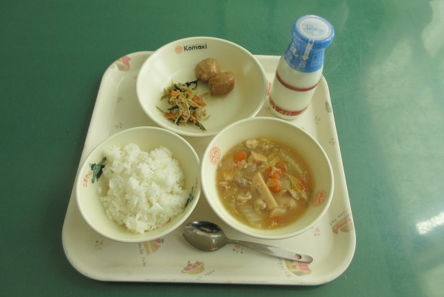 今日の献立は、ごはん、牛乳、うずら卵と生揚げの中華煮、レバー入りつくね、もやしの中華いため です。
