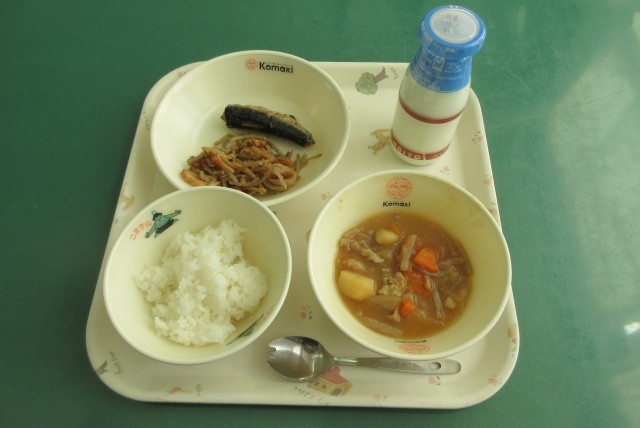 今日の献立は、ごはん、牛乳、肉じゃが、イワシの生姜煮、きんぴらごぼう です。