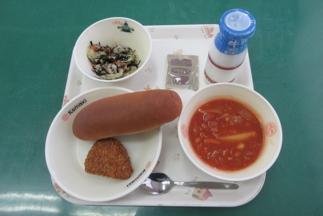今日の献立は、くろロールパン、牛乳、チキンビーンズ、かぼちゃのひき肉フライ、ひじきの和風マリネ、ココア牛乳のもと です。