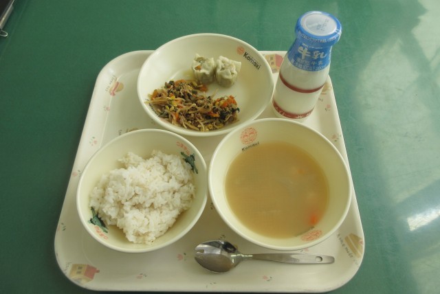 今日の献立は、麦ごはん、牛乳、トックスープ、野菜シューマイ、ビビンバ です。。