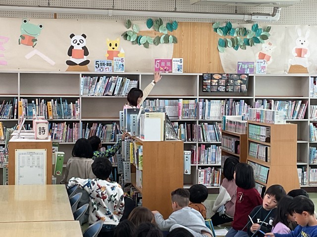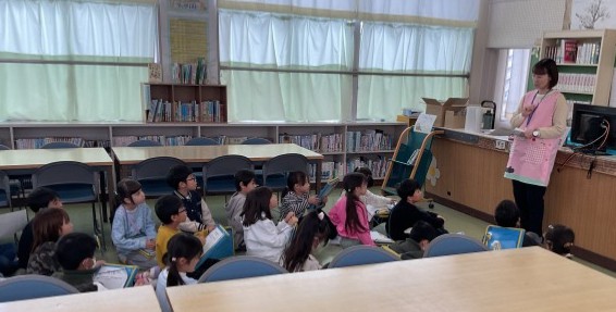 先日の味岡市民センター見学で市の図書館について勉強しました。今日は、学校の図書室を管理されている司書の方にお話を伺いました。学校の図書室には1万4000冊の本があります。子どもたちが使いやすいよう、本を分類したりや目印を作って掲示したりするなどの工夫がなされています。子どもたちは、図書館と比べながら、話を熱心に聞き、メモをしていました。