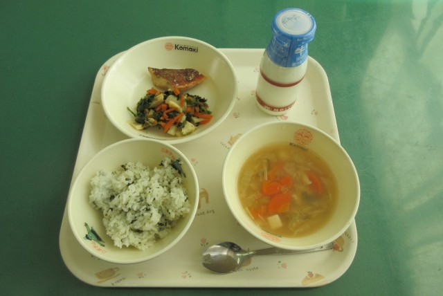 今日の献立は、わかめごはん、牛乳、鶏団子汁、めばるの照り焼き、和風サラダ です。