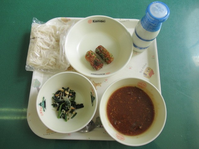 今日の給食は 牛乳、ソフトめん、にくみそかけ、ちくわのいそべあげ、ちぐさあえ です。
