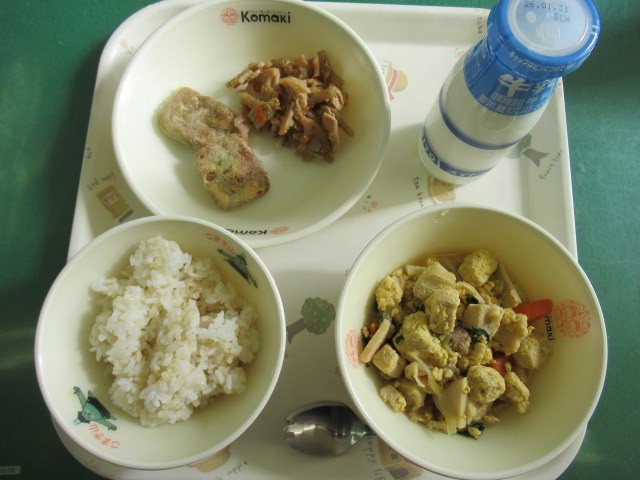 今日の給食は、きんめロウカットげんまいごはん、高野豆腐のたまごとじ、おさかなナゲット、れんこんきんぴら、牛乳 です。