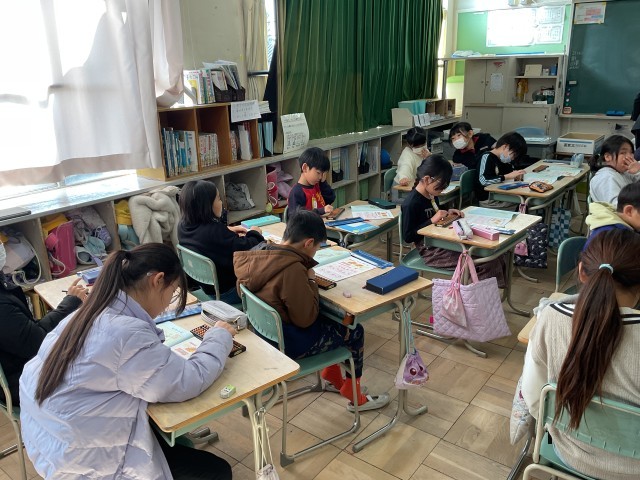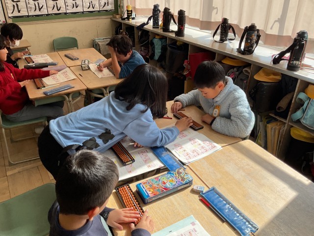 習っている児童がいる一方、多くの児童は初めて使うそろばんに興味津々。