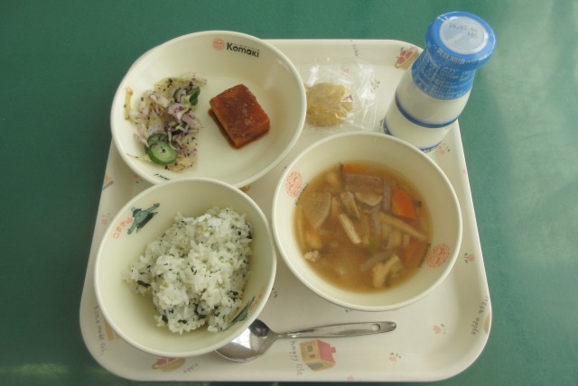 今日の献立は、あいちの大根葉ごはん、牛乳、のっぺい汁、豆腐の田楽、ゆかりあえ、鬼まんじゅう です。