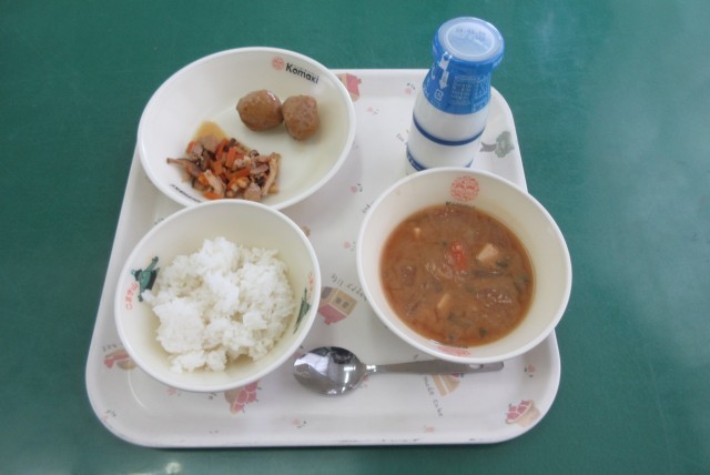 今日の献立は、ごはん、牛乳、呉汁、レバー入りつくね、かきまわしの具 です