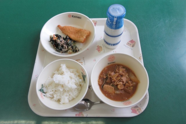 今日の献立は、ごはん、牛乳、うずら卵入り煮みそ、にぎすフライ、五色あえ です。