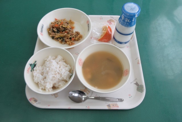 今日の献立は、麦ごはん、牛乳、トックスープ、ビビンバ、いよかん です。