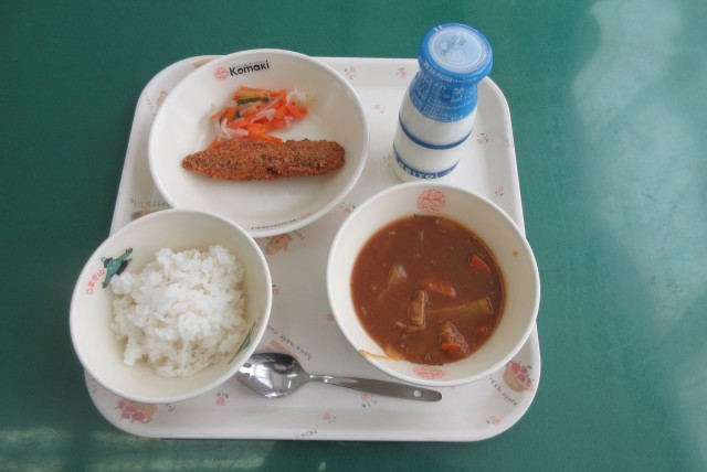 今日の献立は、ごはん、牛乳、野菜カレー、とびうおフライ、にんじんサラダ です。